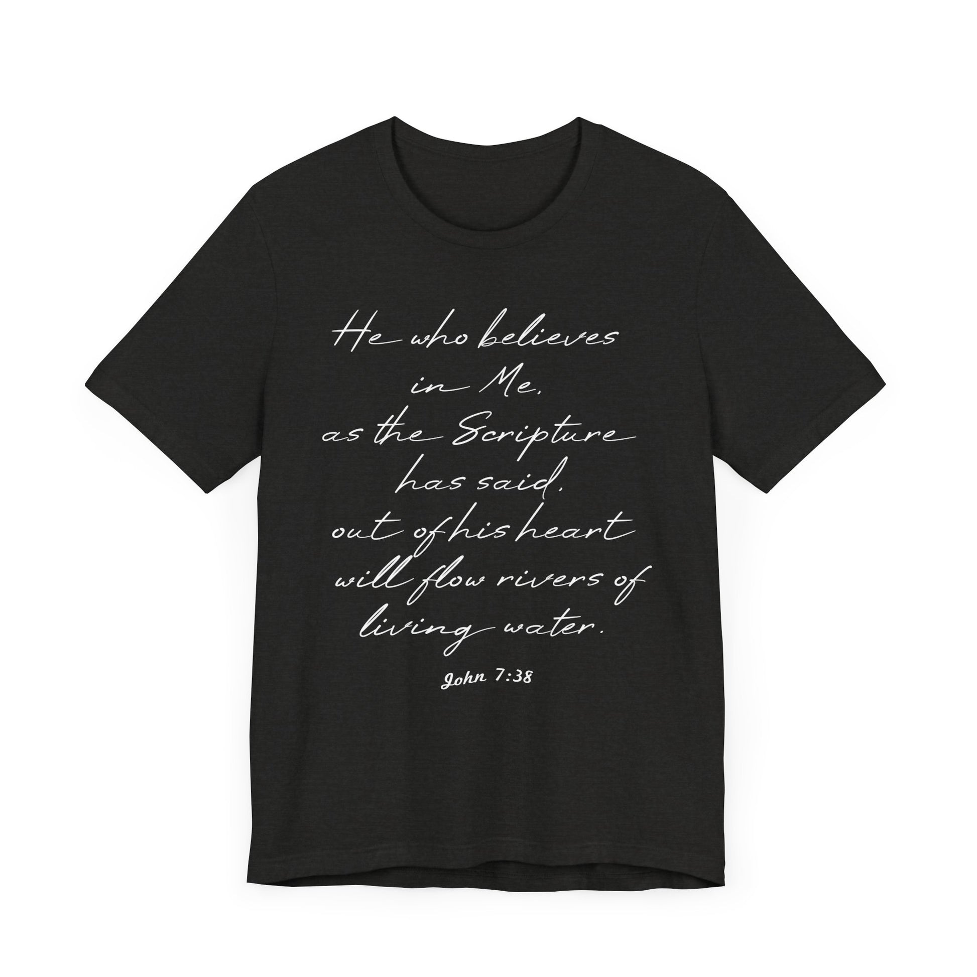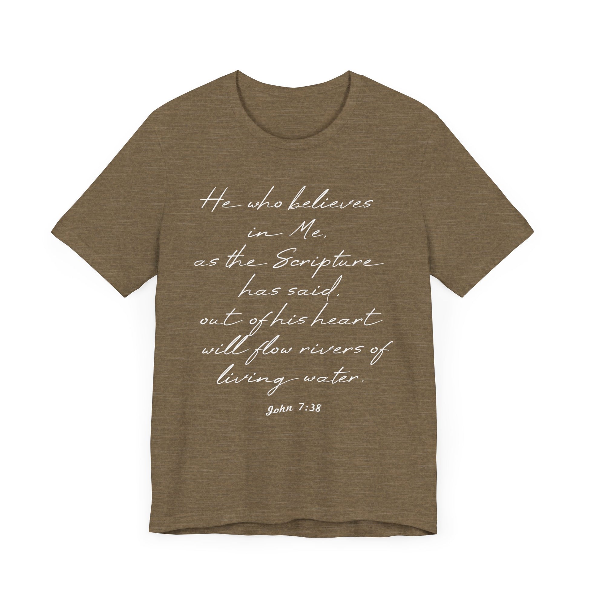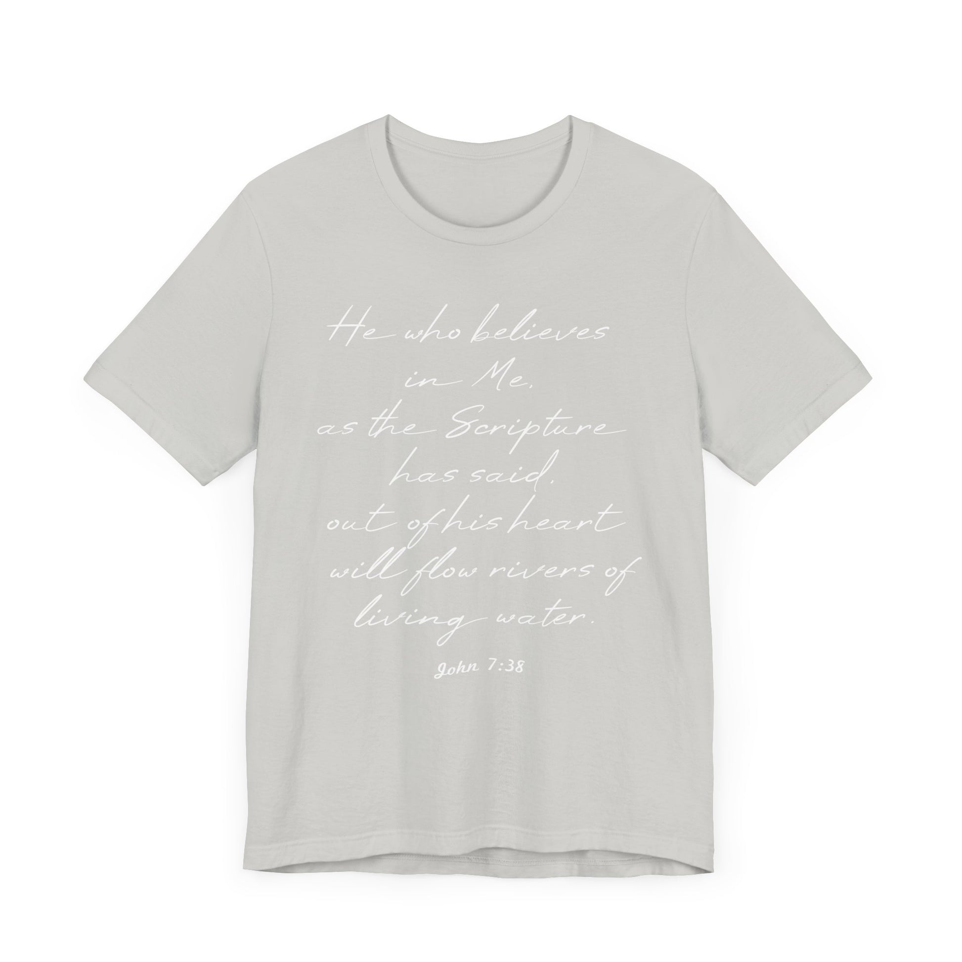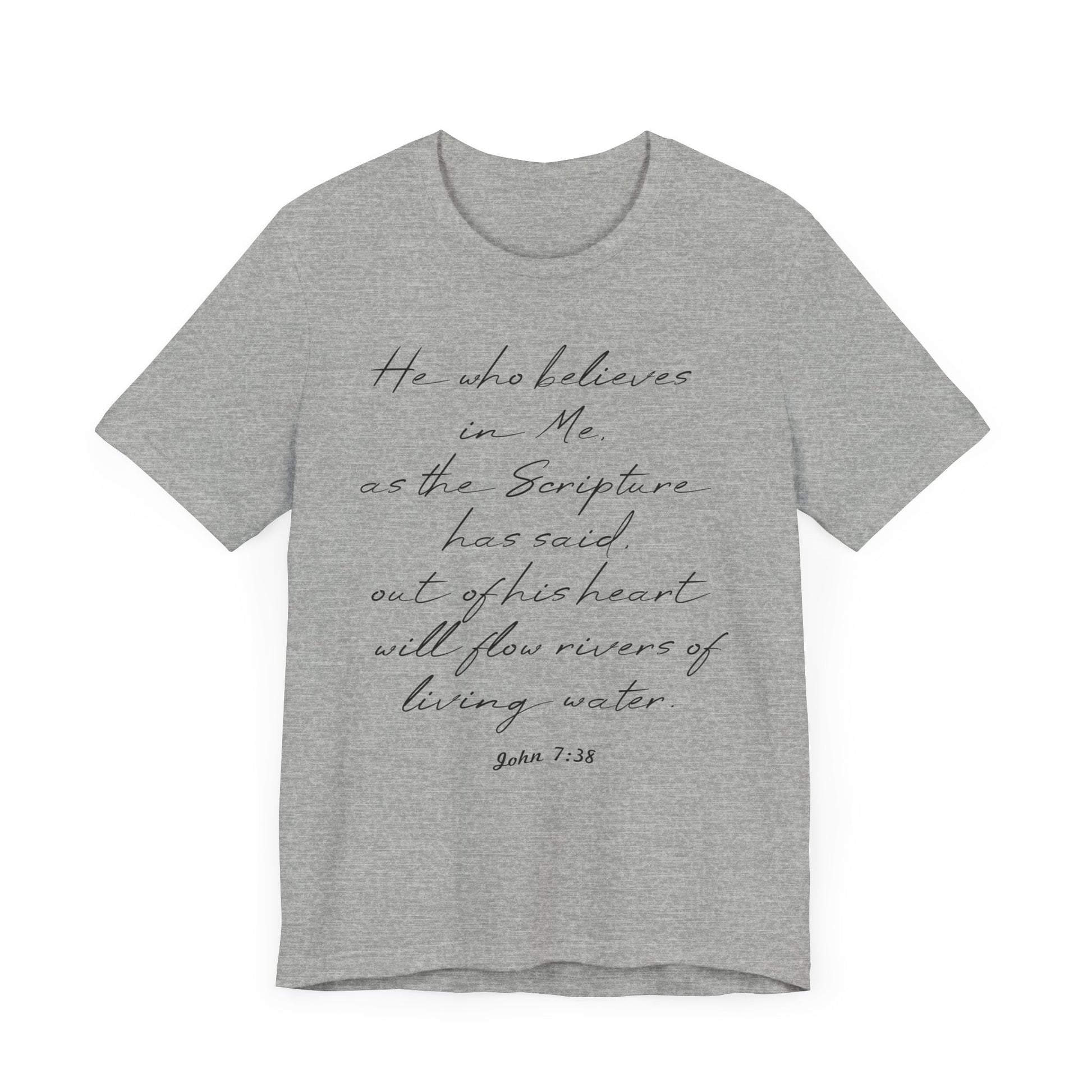 Stay comfortable and inspired with our Living Water Jersey Short Sleeve Tee. Featuring the powerful Bible verse John 7:38, this tee will help you stay focused on your faith while keeping you cool and comfortable. Perfect for everyday wear, add this tee to your wardrobe today.