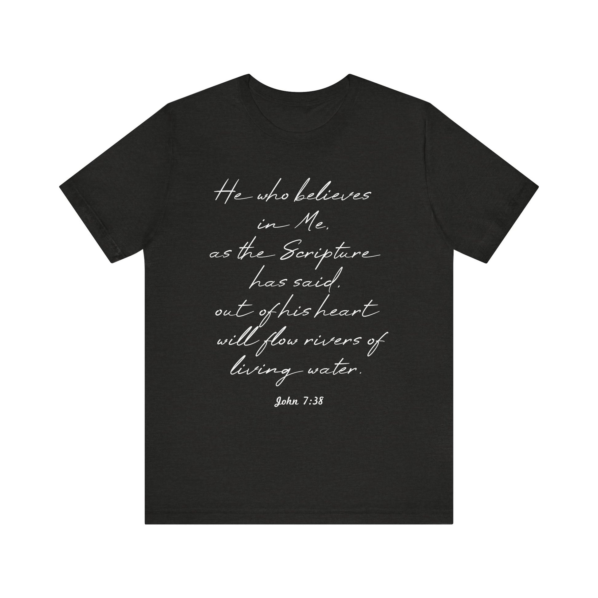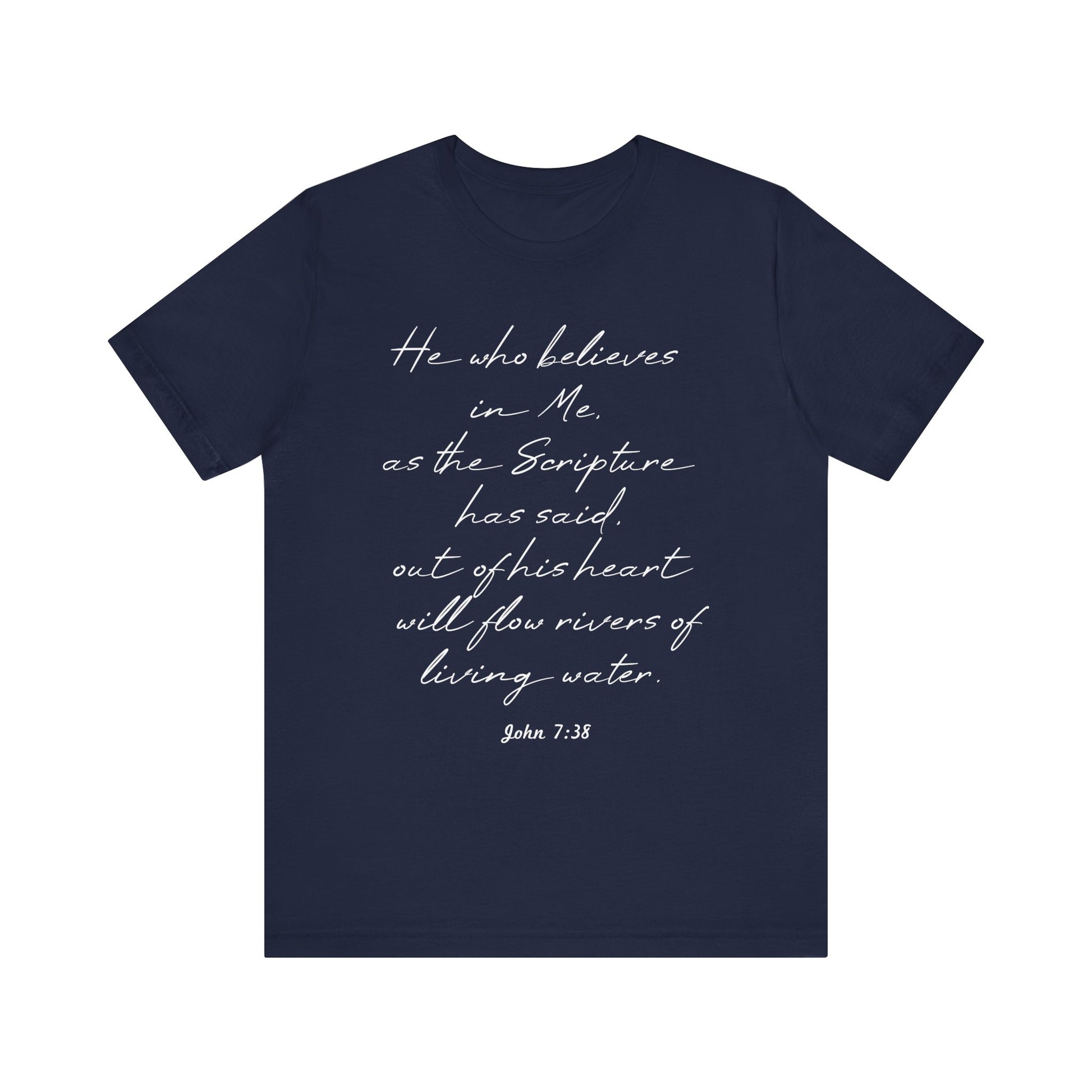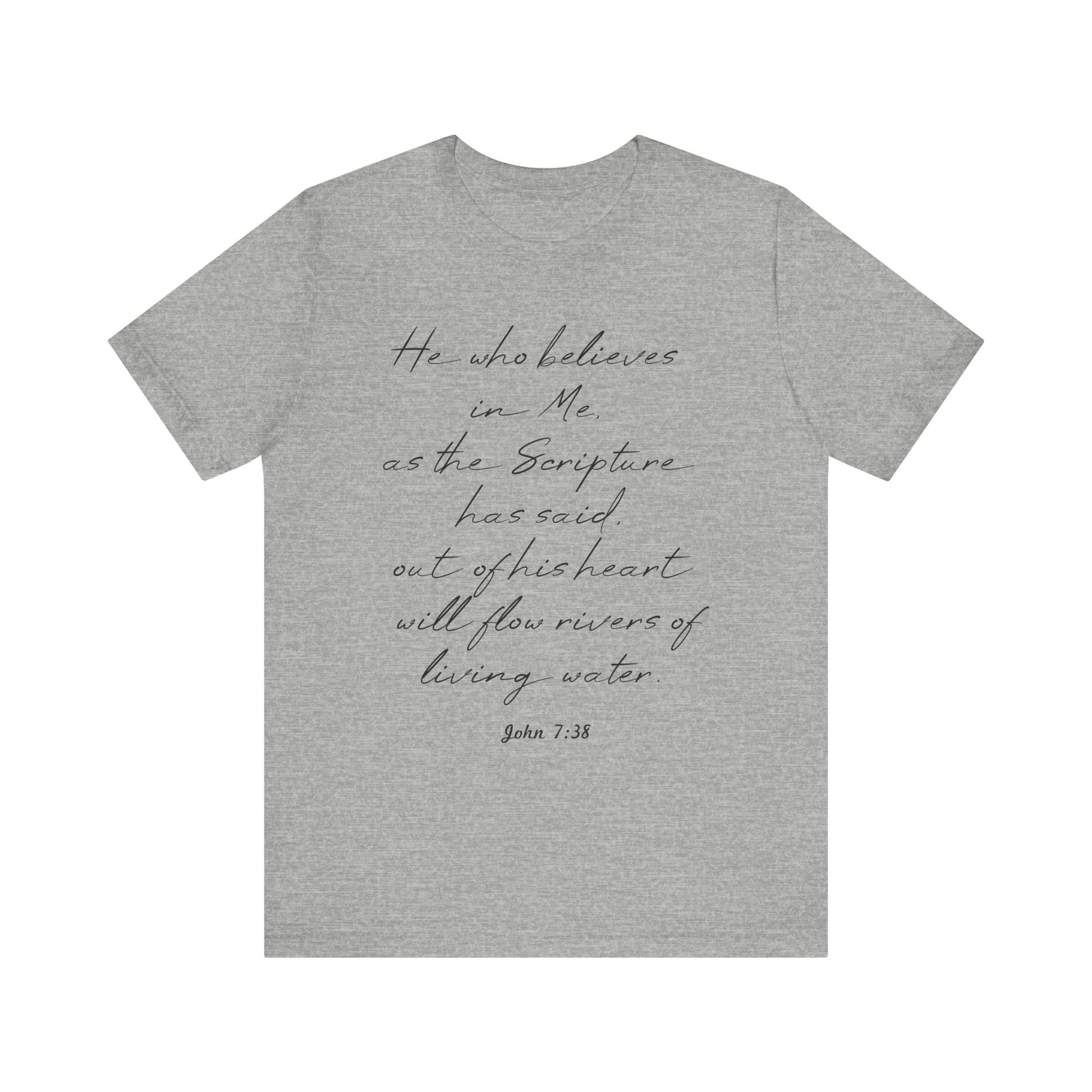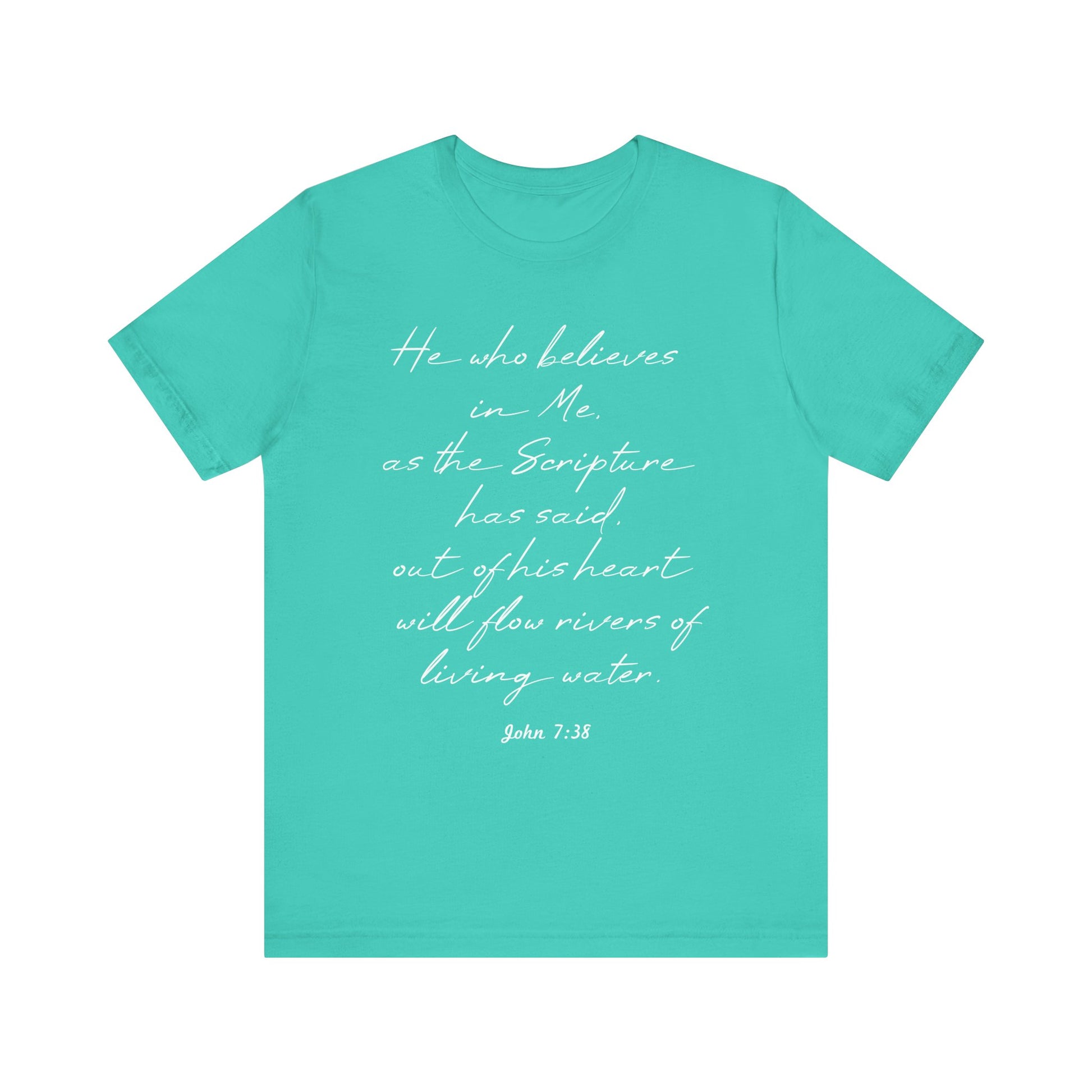 Stay comfortable and inspired with our Living Water Jersey Short Sleeve Tee. Featuring the powerful Bible verse John 7:38, this tee will help you stay focused on your faith while keeping you cool and comfortable. Perfect for everyday wear, add this tee to your wardrobe today.