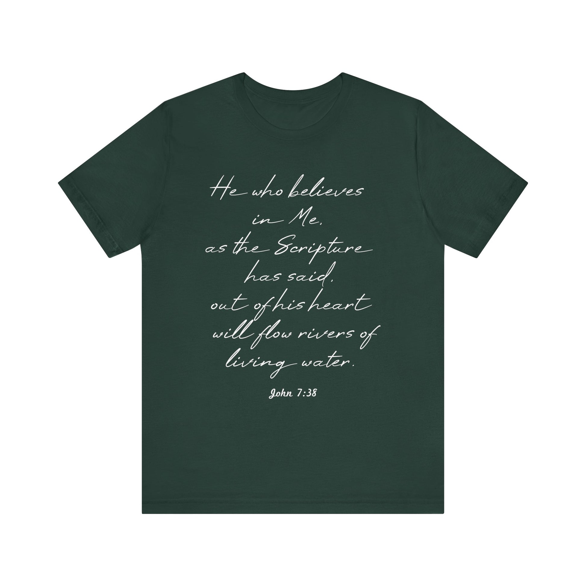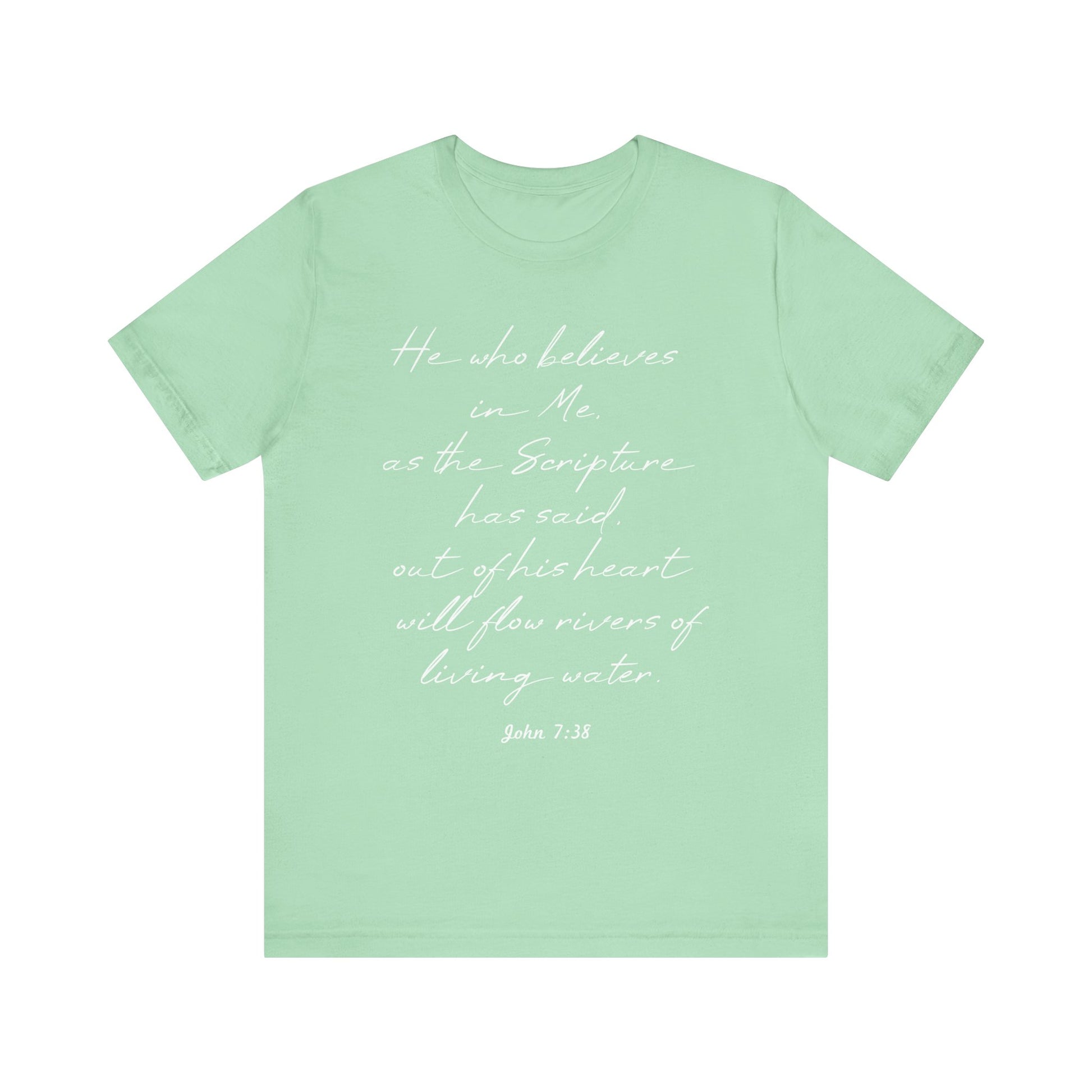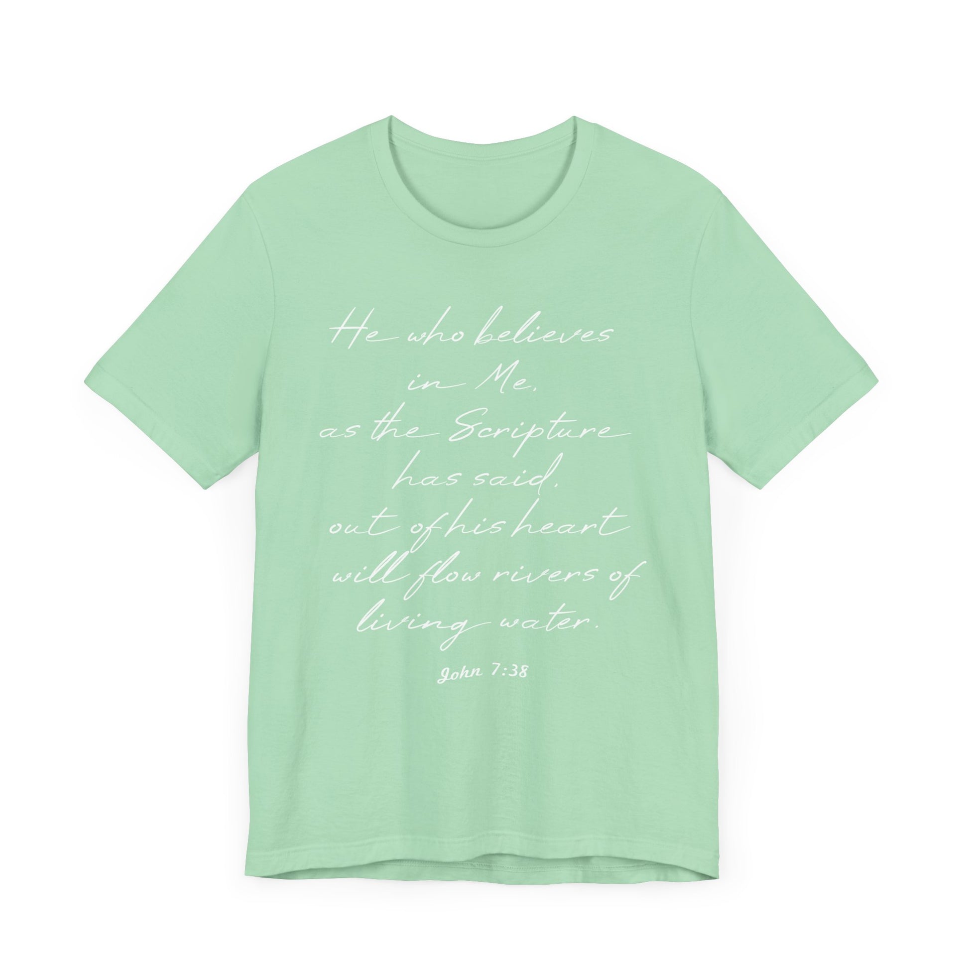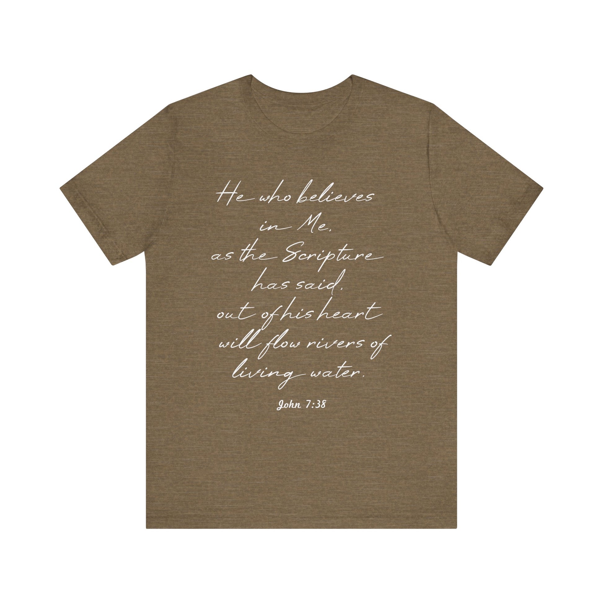 Stay comfortable and inspired with our Living Water Jersey Short Sleeve Tee. Featuring the powerful Bible verse John 7:38, this tee will help you stay focused on your faith while keeping you cool and comfortable. Perfect for everyday wear, add this tee to your wardrobe today.